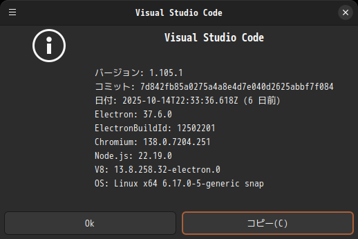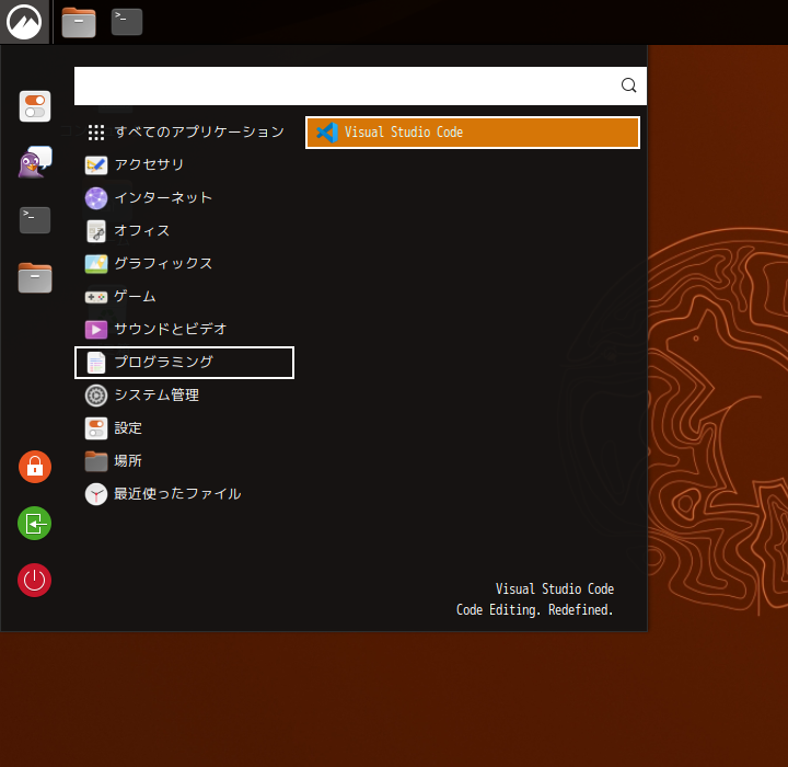 1. 概要 開発環境として、「Visual Studio Code」を使用します。 2. インストール 「ソフトウェア(gnome-software)」で「vscode」を検索して、「code」をインストールします。 3. 起動 「スタート」→「プログラミング」→「Visual Studio Code」