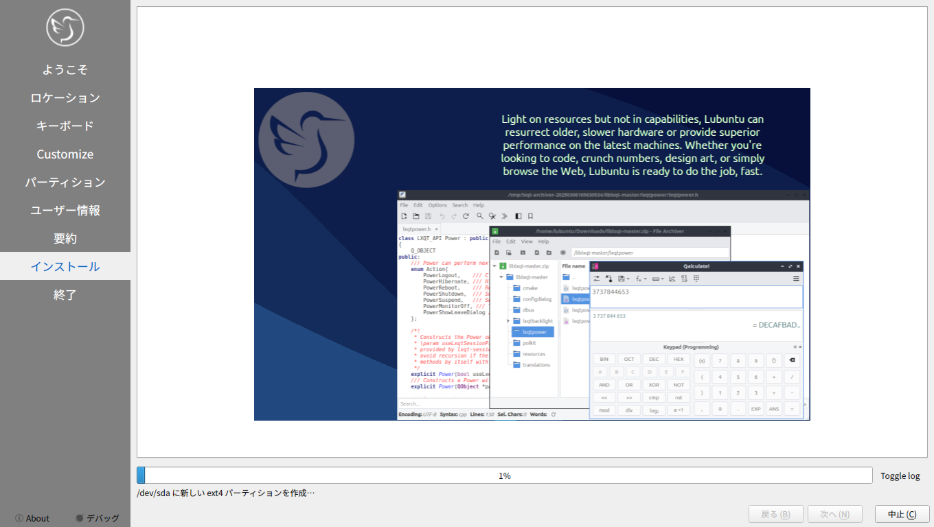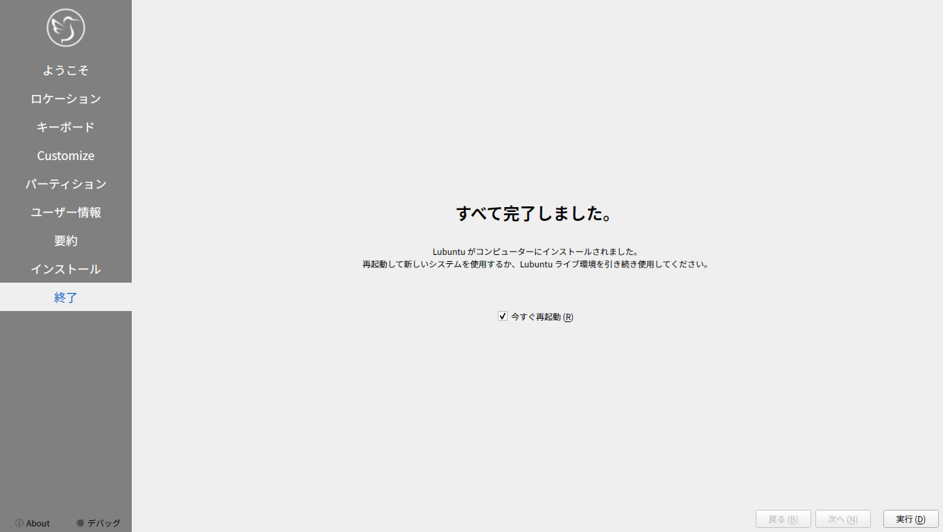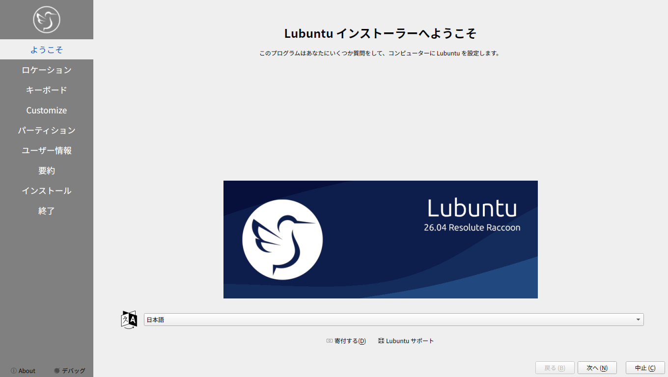 他の「Ubuntu」系のディストリビューションは、いきなりインストーラが起動しますが、「Lubuntu」では、インストーラは、手動で起動します。