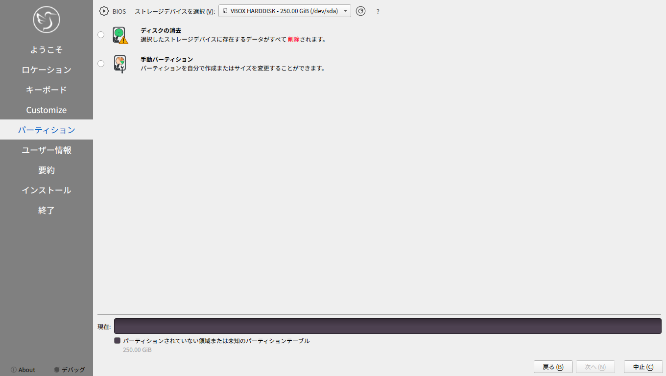今回、「VirtuialBox」上へインストールするには、グラフィックスコントローラに「VBoxSVGA」を設定しないと、インストーラが起動しませんでした。