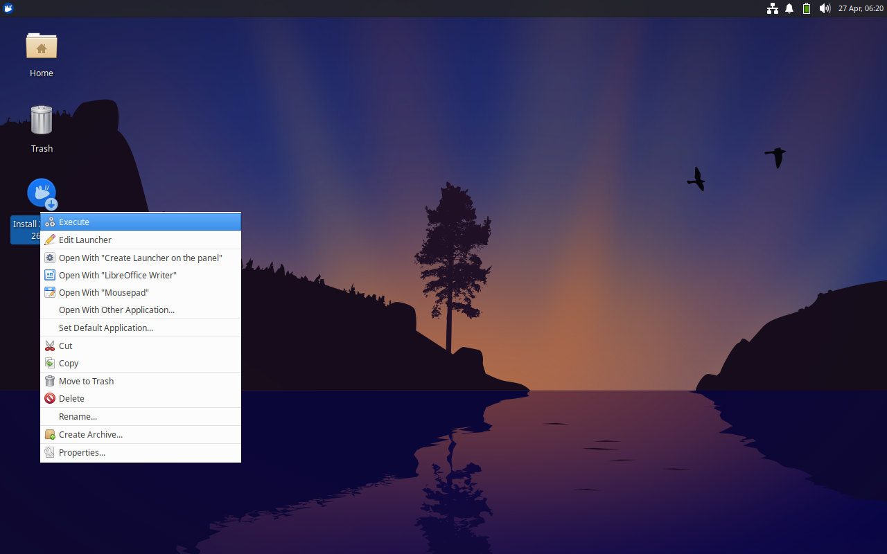 1. 概要 インストールの手順に関しては、「Linux - Ubuntu - 26.04 - 共通事項」をご参照ください。 2. インストール デスクトップが表示された時点で、「Install Xubuntu」を右クリックして「Execute」