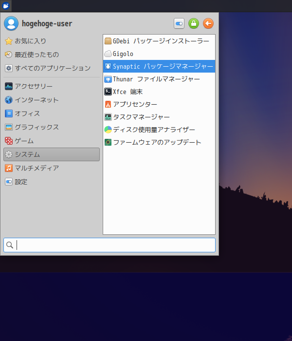 「スタート」→「システム」→「Synaptic パッケージマネージャ」