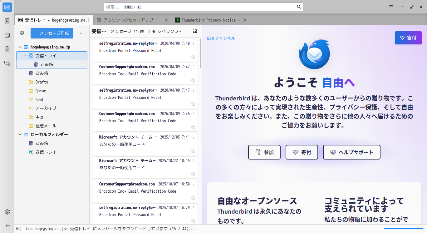初回起動時は、「メールアドレスのセットアップ」から起動します。 起動直後に、受信トレイを開いた状態です。 2026年4月27日の時点で、下記のバージョンでした。 アカウントセットアップ・他、操作方法については「メールクライアント - Thunderbird」をご参照ください。 |