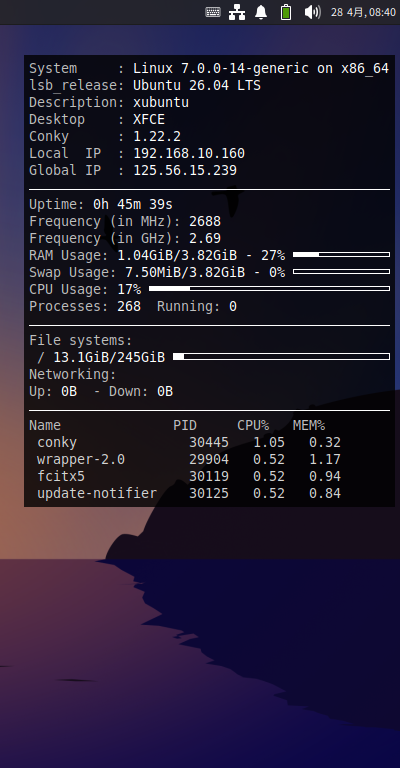 ログイン後に、デスクトップ右に、「Conky」の表示が現れます。