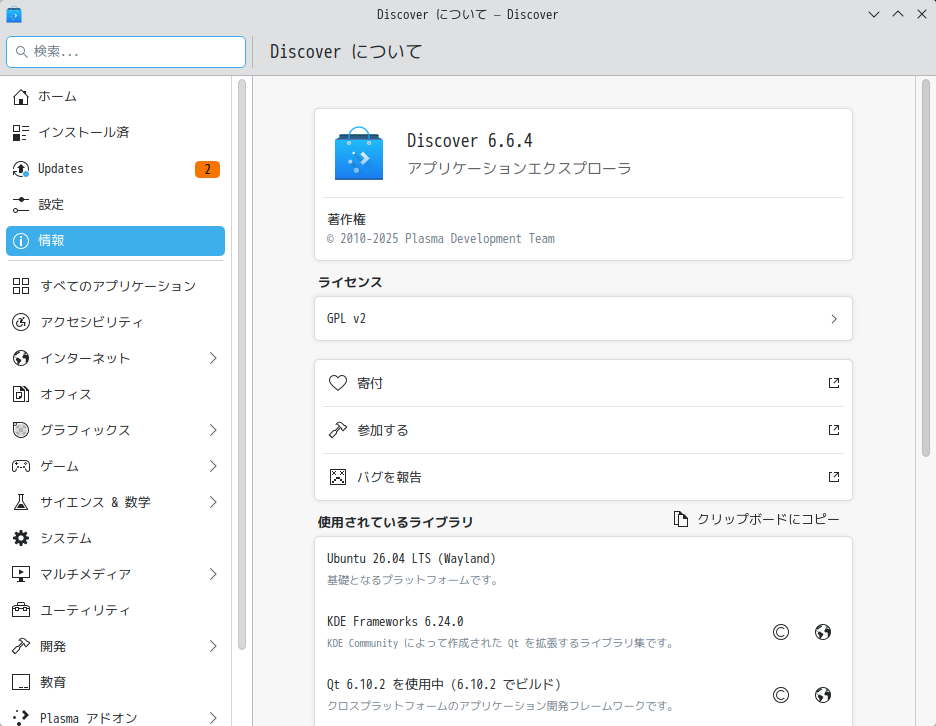 「Discover」の詳細の操作等については「Linux - 共通事項 - パッケージ管理フロントエンド」をご参照ください。