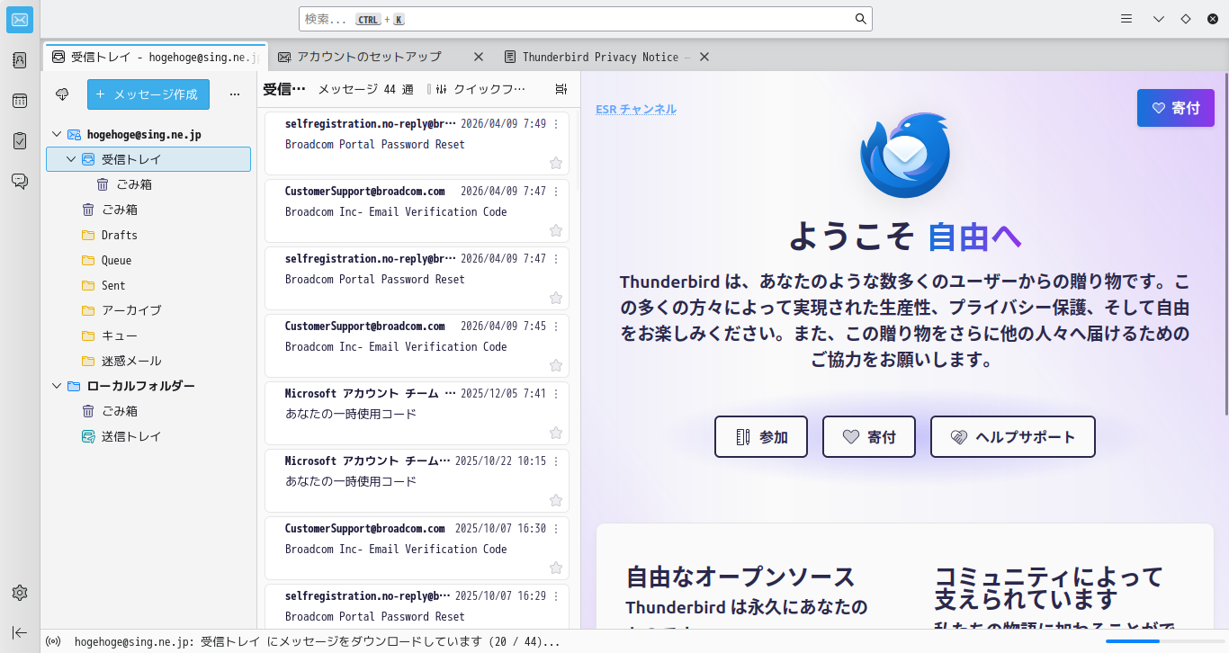 初回起動時は、「メールアドレスのセットアップ」が起動します。 起動直後、受信トレイを開いた状態です。 2026年4月28日の時点で、下記のバージョンでした。 設定ウィザード・日本語化、他、操作方法については「メールクライアント - Thuderbird」をご参照ください。 |