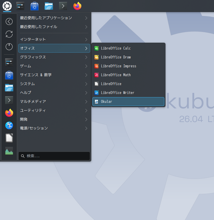 1. 概要 ドキュメントビューアとして、「Okular」を使用します。 「Okular」は、デフォルトでインストールされています。 2. 起動 「スタート」→「オフィス」→「Okular」