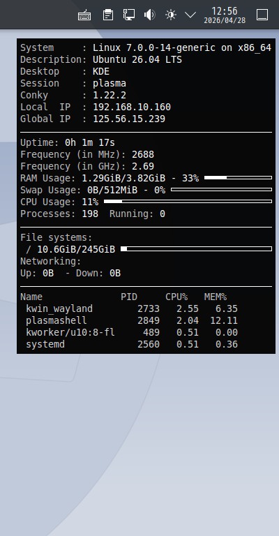 再ログイン後に、デスクトップ右に、「Conky」の表示が現れます。