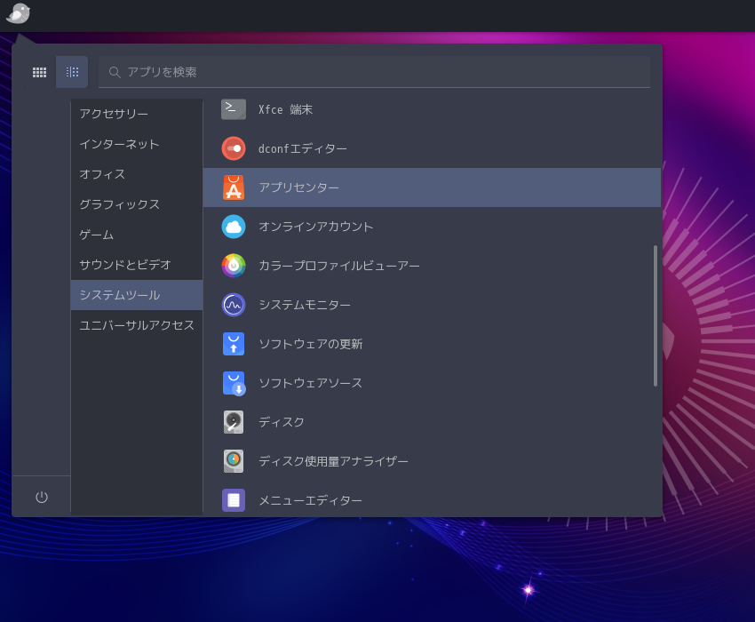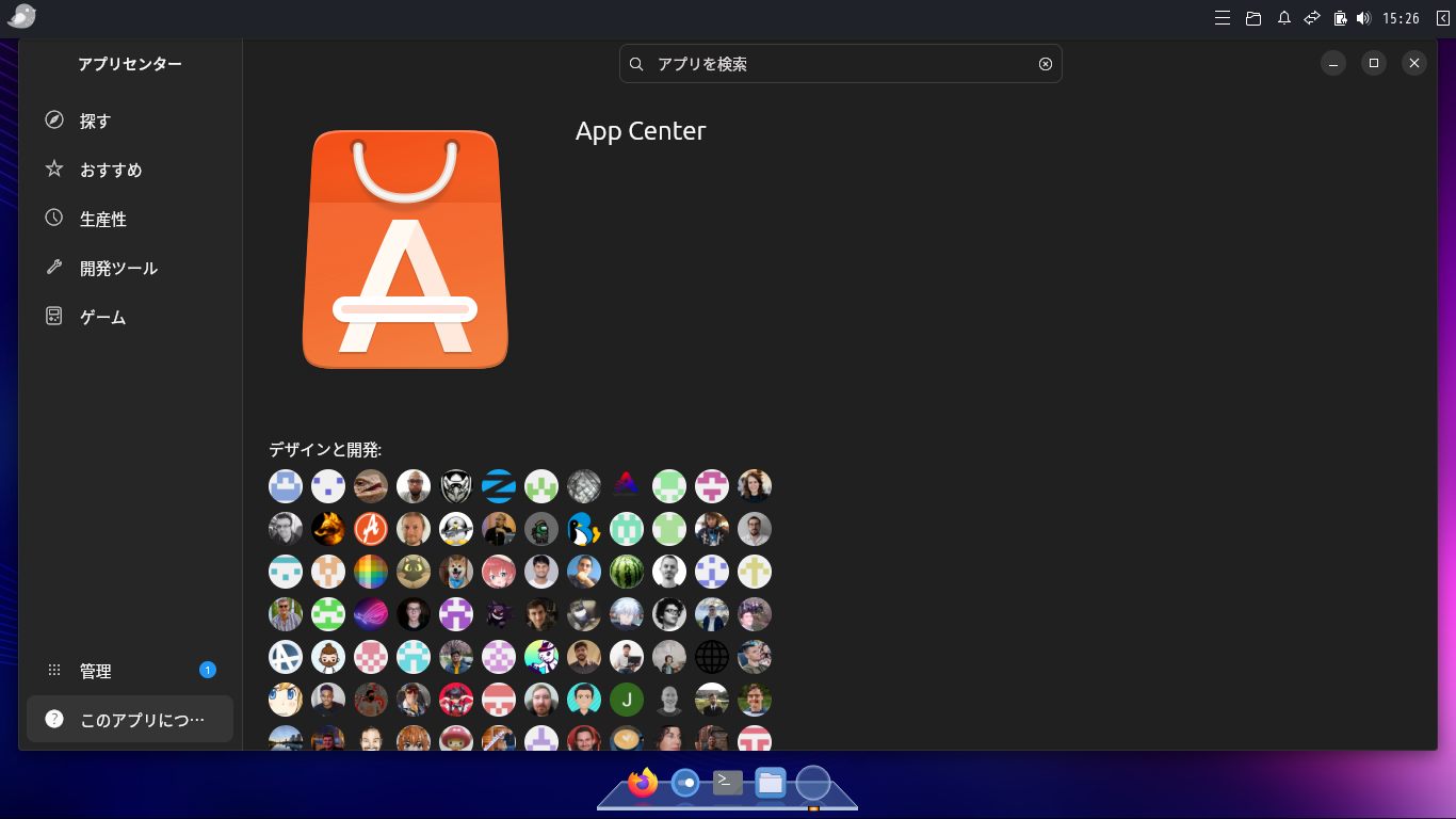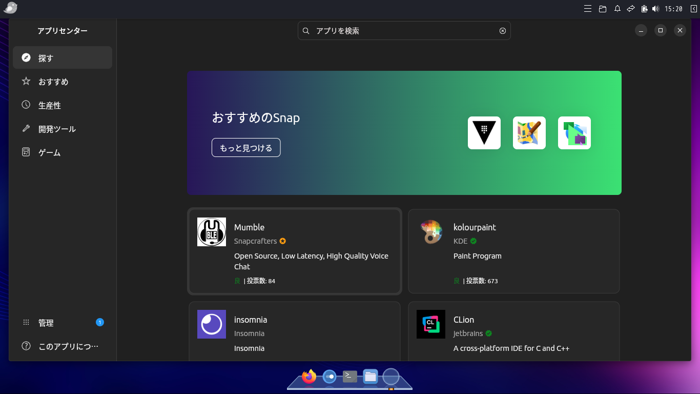 パッケージ管理の「GUI」フロントエンドとしては、アプリセンター(snap-store)というソフトウェアがインストールされています。
