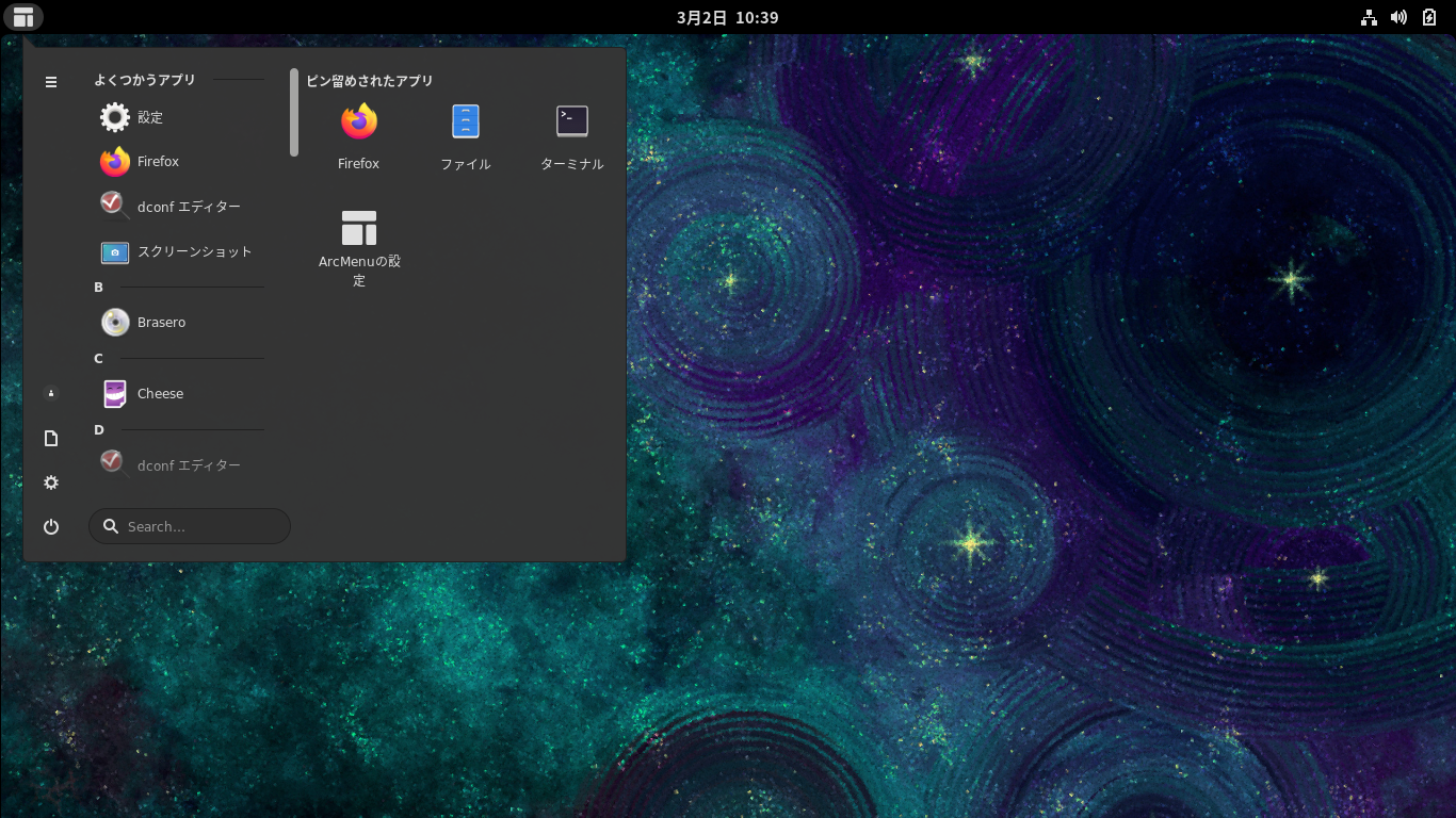 メニューは、ブラウザによる拡張機能のインストールで、「Arc Menu」をインストールしました。