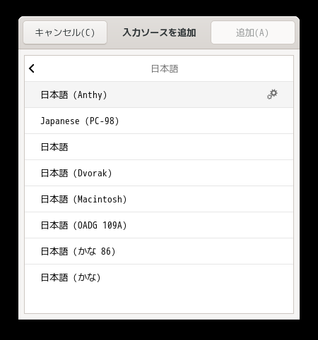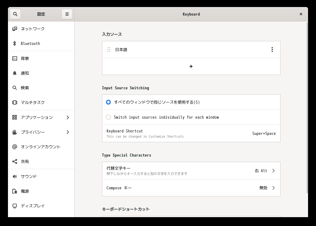 設定を開いて  「Keyboard」  「入力ソース」の「+」