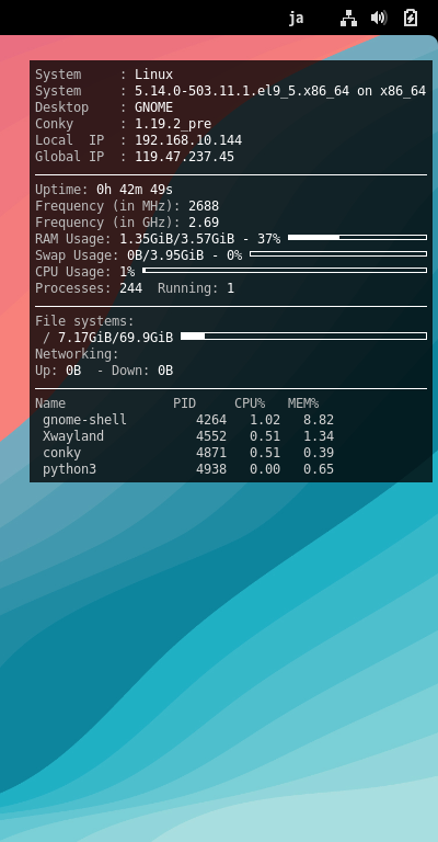 再ログイン後、デスクトップ右に、「Conky」の表示が現れます。