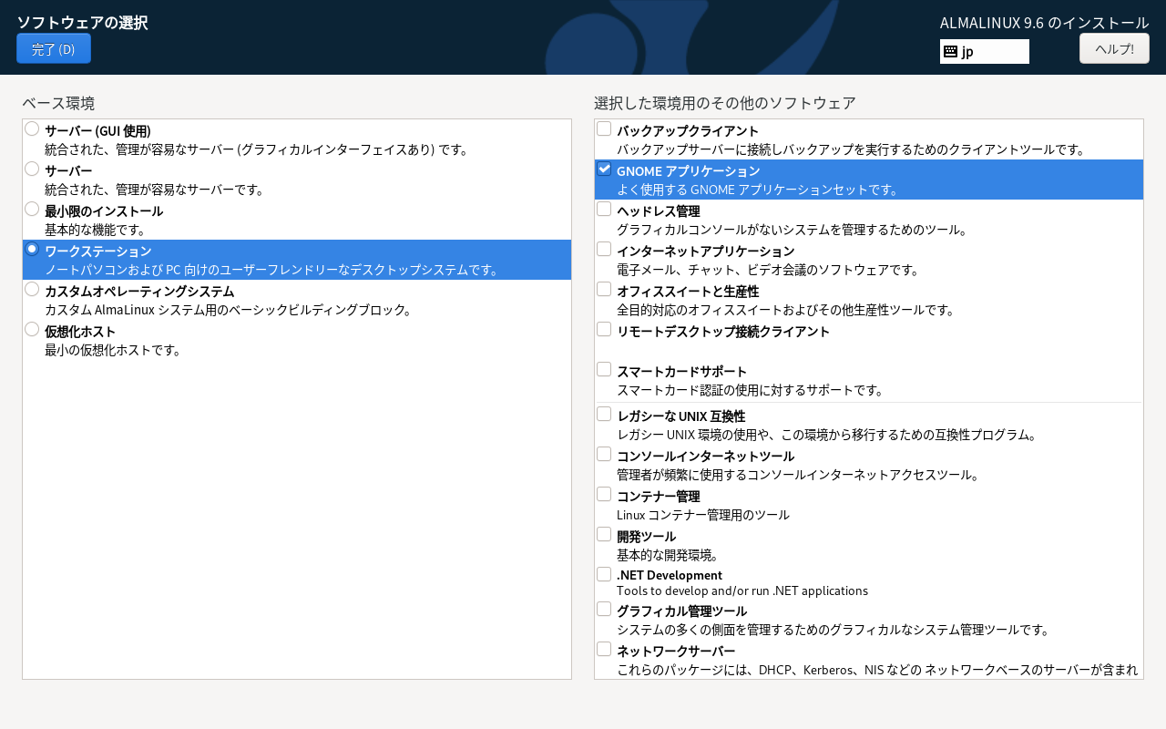 「ワークステーション」「GNOME アプリケーション」を選択して
