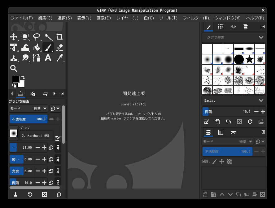 起動直後の状態です。 2025年5月22日の時点で、下記のバージョンでした。 操作については、「画像編集ソフト GIMP2」に掲載しています。 上記は簡単なものですので、詳細なものがほしい方は、各所に初歩の手引きから応用編までありますので、そちらを参考にしてください。 |