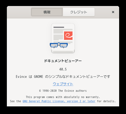 1. 概要 ドキュメントビューアとして「Evince」を使用します。 「Evince」は、デフォルトでインストールされています。 2. 起動 「スタート」→「ド」→「ドキュメントビューアー」