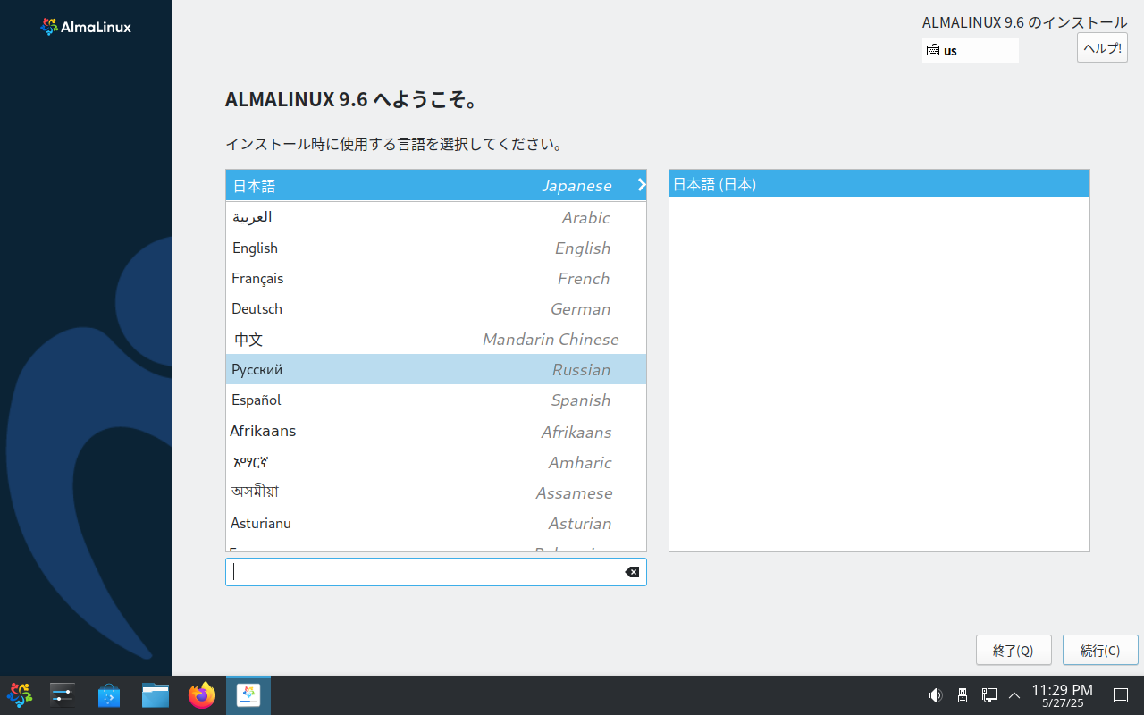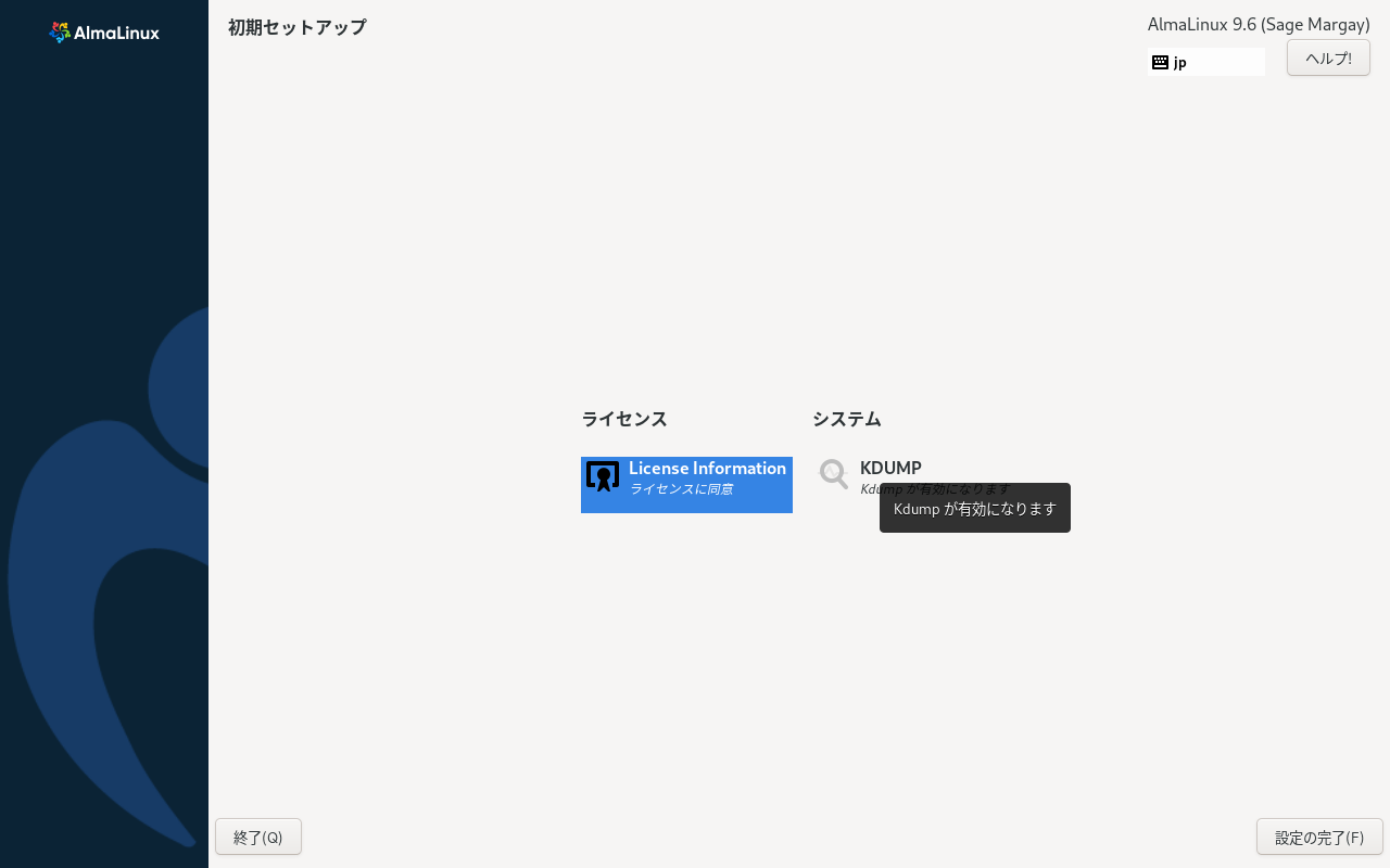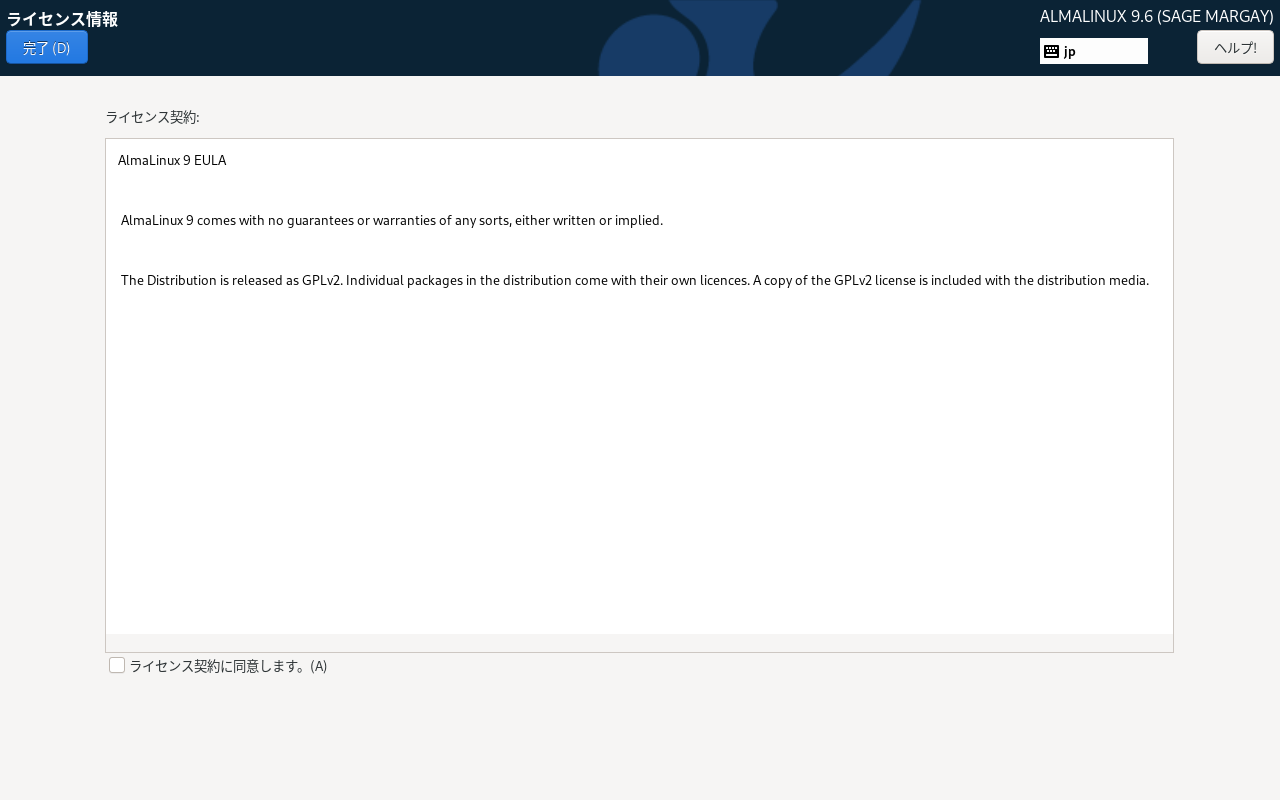 以降の手順は、「AlmaLinux・Rocky Linux 9.6 - 共通事項」のインストール手順と同様です。