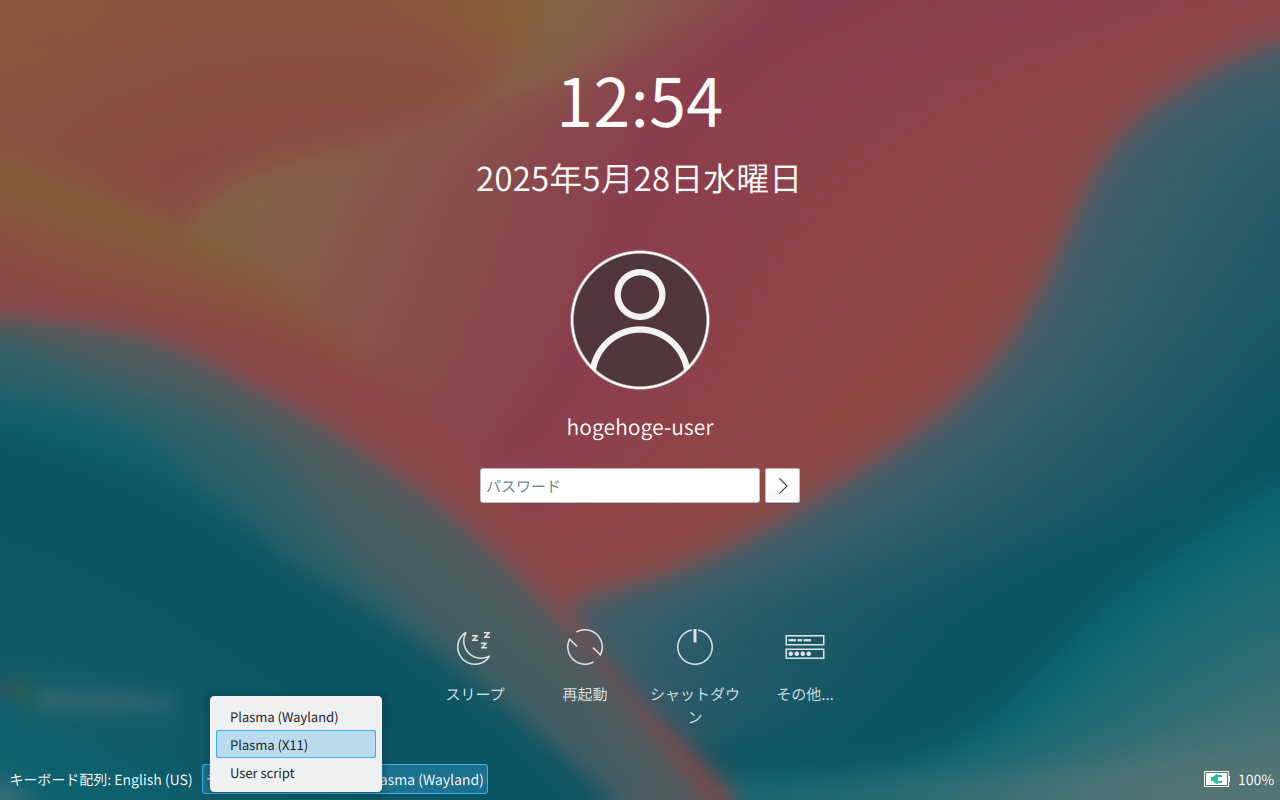 「VirtualBox」上で、動作させている場合は、「Plasma(X11)」でログインします。