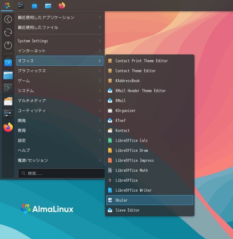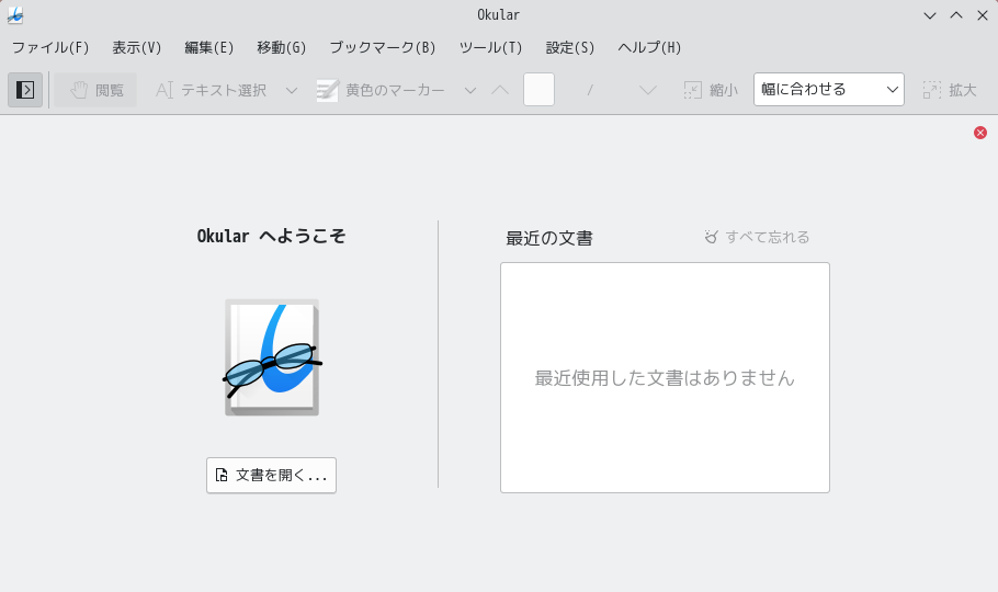 1. 概要 ドキュメントビューアとして「Okular」を使用します。 「Okular」は、デフォルトでインストールされています。 2. 起動 「スタート」→「オフィス」→「Okular」