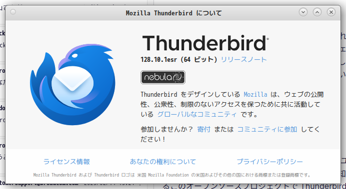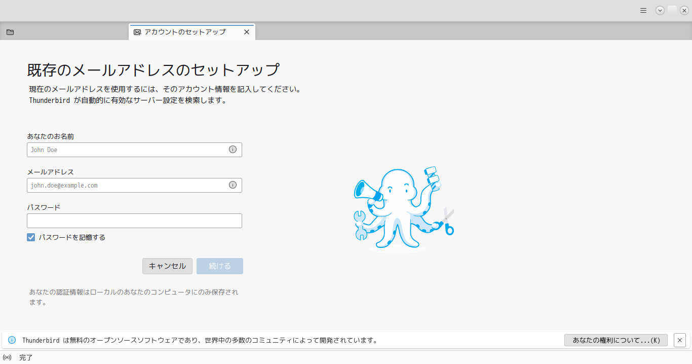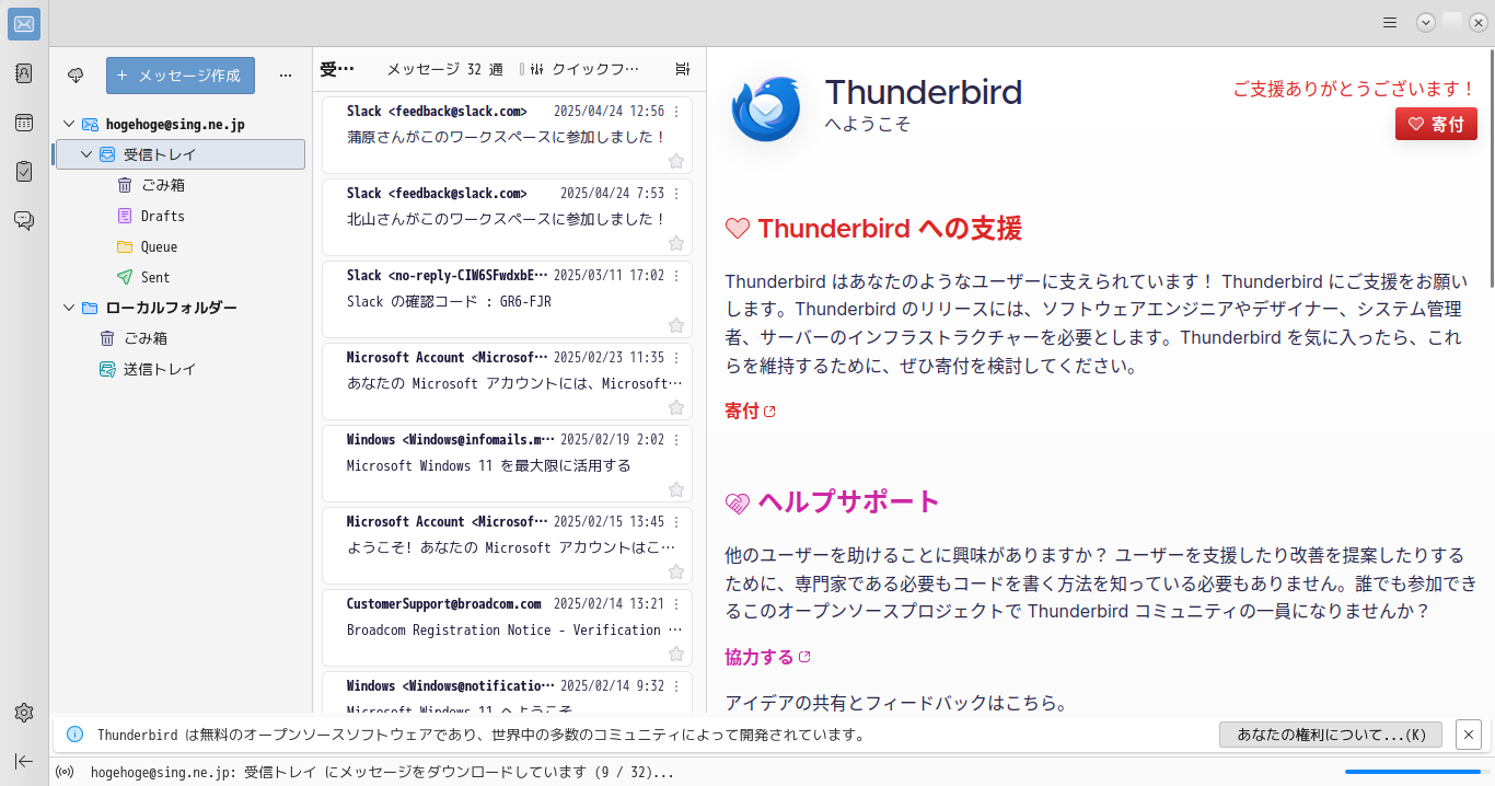 初回起動時は「アカウントのセットアップ」から始まります。 アカウントのセットアップを行います。 起動直後の状態です。 2025年5月29日の時点で、下記のバージョンでした。 「アカウントのセットアップ」他、操作方法については、「メール クライアント ソフト - Thunderbird」をご参照ください。 |