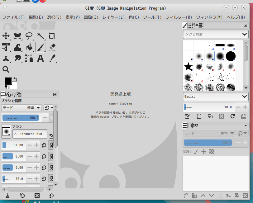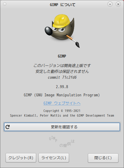 起動直後の状態です。 2025年5月29日の時点で、下記のバージョンでした。 操作については、「画像編集ソフト GIMP2」に掲載しています。 上記は簡単なものですので、詳細なものがほしい方は、各所に初歩の手引きから応用編までありますので、そちらを参考にしてください。 |