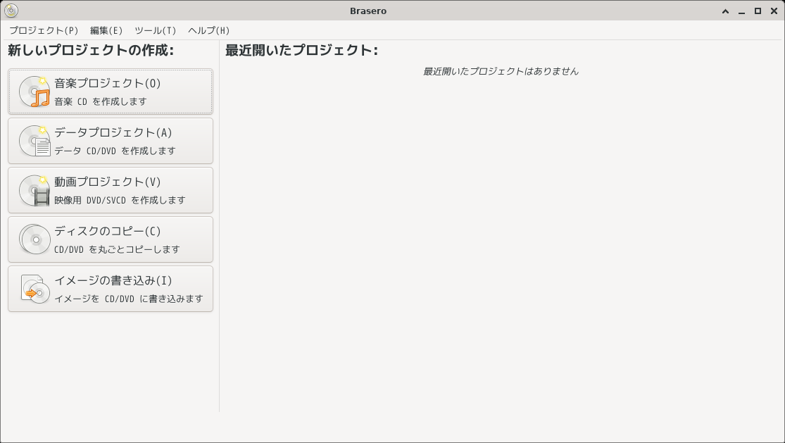 1. 概要 光ディスクライティングソフトとして「Brasero」を使用します。 2. インストール 「root」ユーザ権限で。 dnf install -y brasero 3. 起動 「スタート」→「サウンドとビデオ」→「Brasero」
