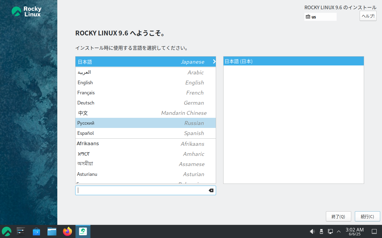 起動方法等は、「AlmaLinux・Rocky Linux 9.6 - 共通事項」のインストール手順と同様です。