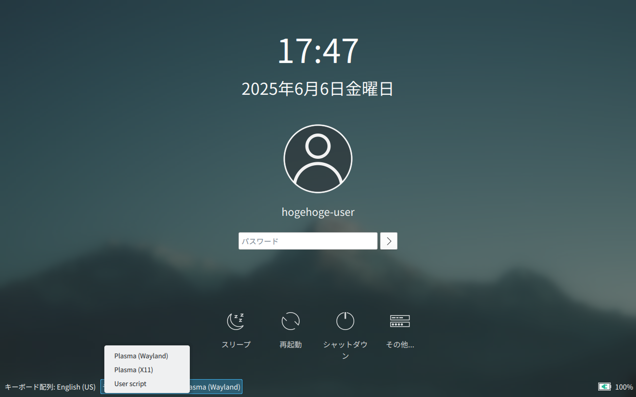 「VirtualBox」上で、動作させている場合は、「Plasma(X11)」でログインします。