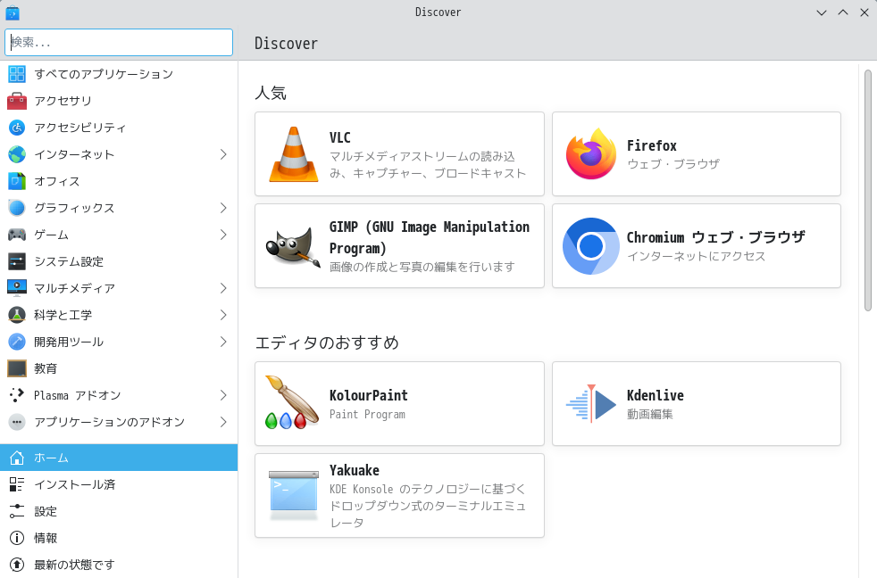1. 概要 パッケージ管理フロントエンドとして「Discover」がインストールされています。 だたし、「Discover」は、貧相であるので、わたしは、コマンドラインから「dnf」を使用することの方が多いです。 2. 起動 「スタート」→「システム」→「Discover」