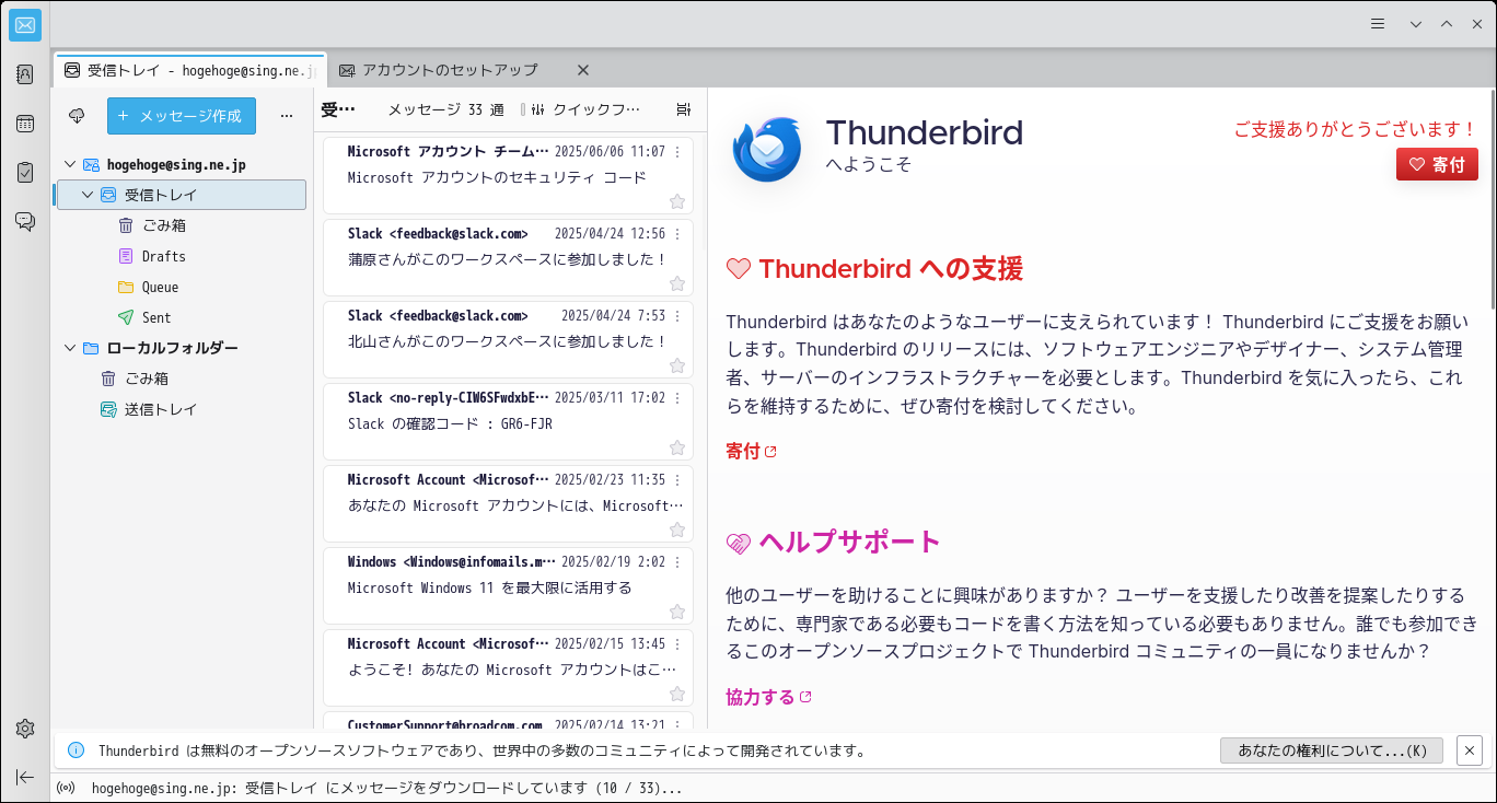初回起動時は「アカウントのセットアップ」から始まります。 アカウントのセットアップを行います。 起動直後の状態です。 2025年6月9日の時点で、下記のバージョンでした。 「アカウントのセットアップ」他、操作方法については、「メール クライアント ソフト - Thunderbird」をご参照ください。 |