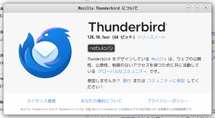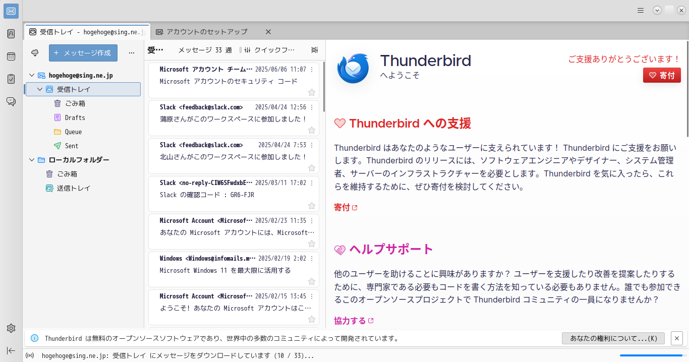 初回起動時は「アカウントのセットアップ」から始まります。 アカウントのセットアップを行います。 起動直後の状態です。 2025年6月10日の時点で、下記のバージョンでした。 「アカウントのセットアップ」他、操作方法については、「メール クライアント ソフト - Thunderbird」をご参照ください。 |