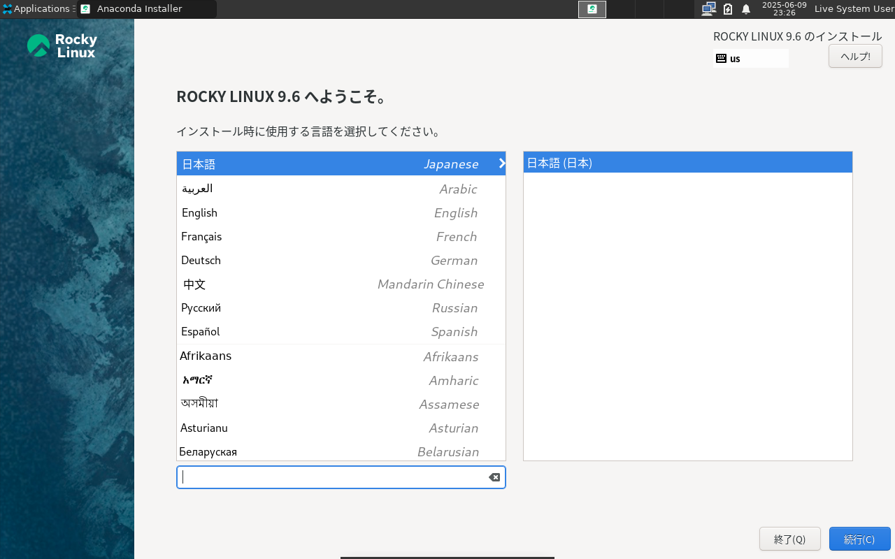 起動方法等は、「AlmaLinux・Rocky Linux 9.6 - 共通事項」のインストール手順と同様です。