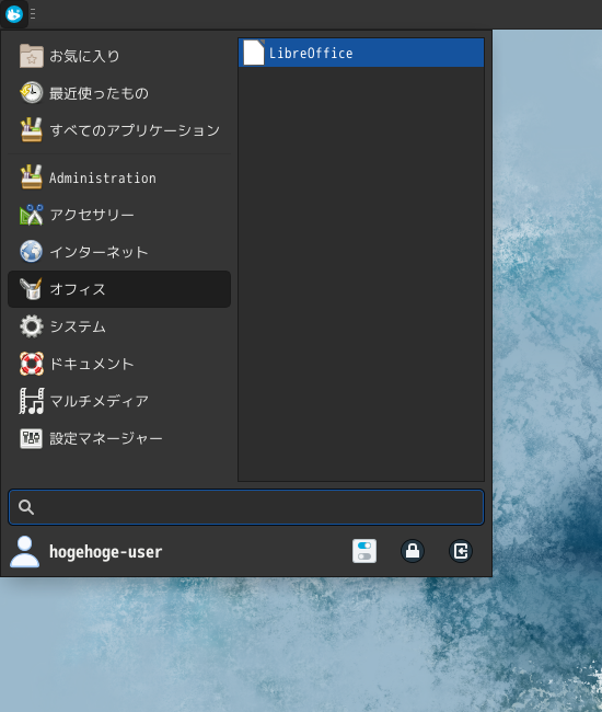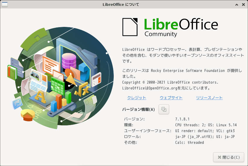 「XFCE」では、「LibreOffice」がデフォルトでインストールされていますが、日本語化ファイルがインストールされていません。