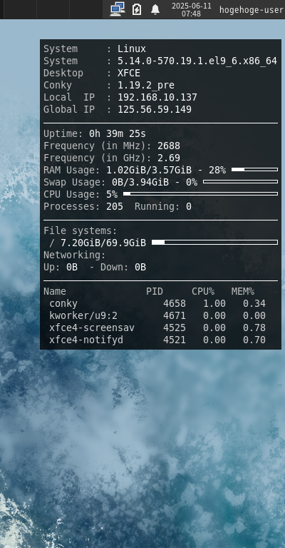 再ログイン後、デスクトップ右に、「Conky」の表示が現れます。