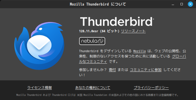 初回起動時は「アカウントのセットアップ」から始まります。 起動直後の状態です。 2025年6月11日の時点で、下記のバージョンでした。 「アカウントのセットアップ」他、操作方法については、「メール クライアント ソフト - Thunderbird」をご参照ください。 |