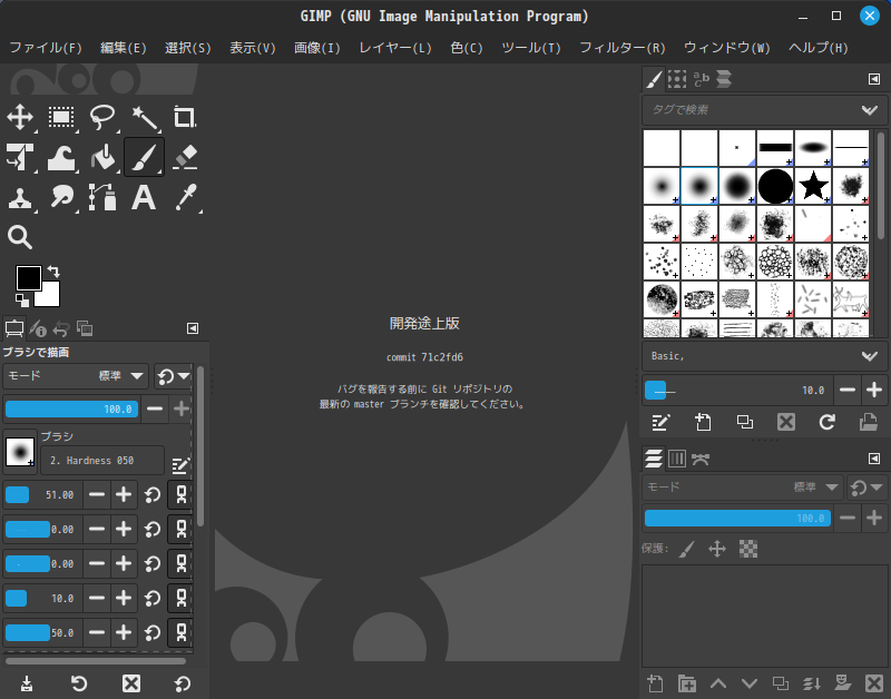 起動直後の状態です。 2025年6月11日の時点で、下記のバージョンでした。 操作については、「画像編集ソフト GIMP2」に掲載しています。 上記は簡単なものですので、詳細なものがほしい方は、各所に初歩の手引きから応用編までありますので、そちらを参考にしてください。 |