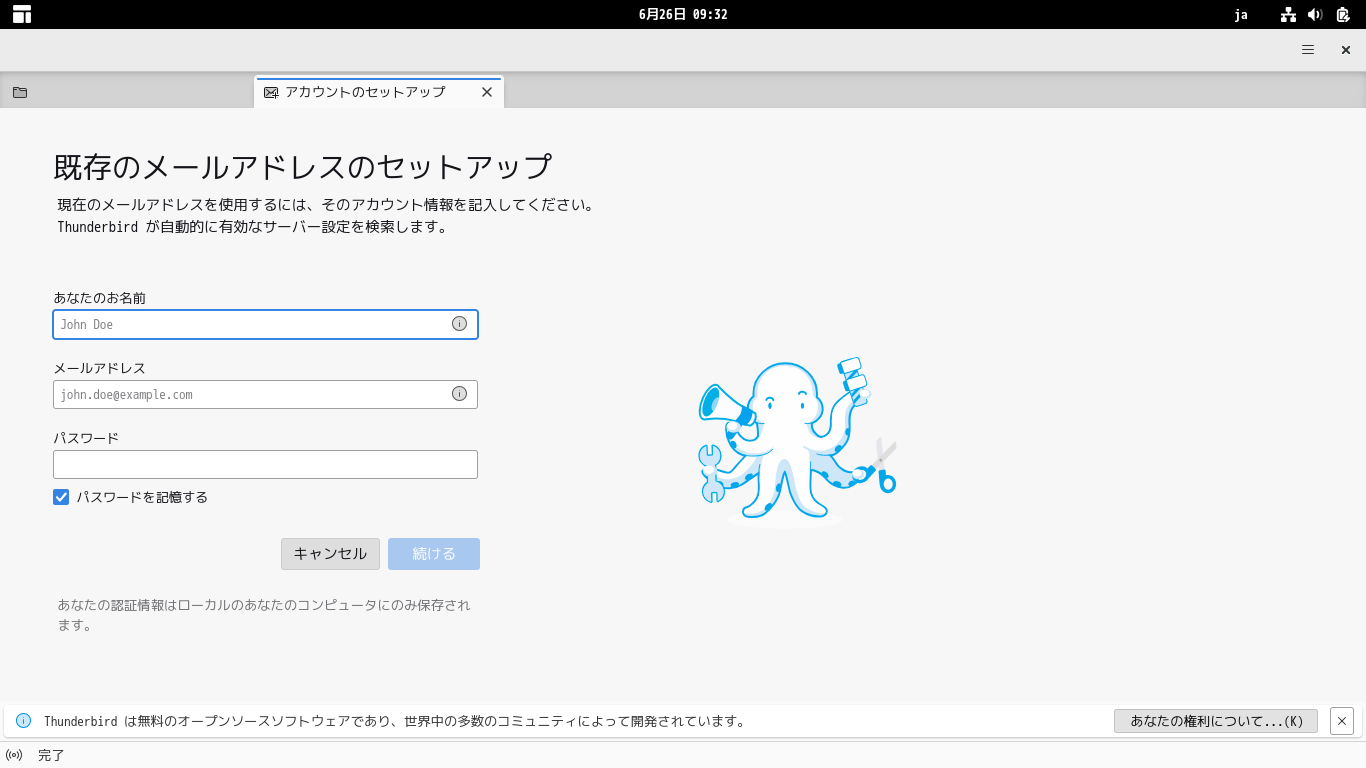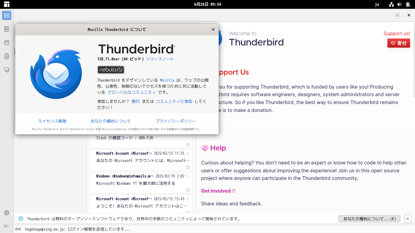 初回起動時は「アカウントのセットアップ」から始まります。 アカウントのセットアップを行います。 起動直後に、受信トレイを開いた状態です。 2025年6月26日の時点で、下記のバージョンでした。 「アカウントのセットアップ」他、操作方法については、「メール クライアント ソフト - Thunderbird」をご参照ください。 |