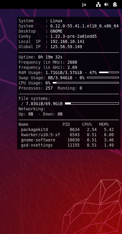 再ログイン後、デスクトップ右に、「Conky」の表示が現れます。