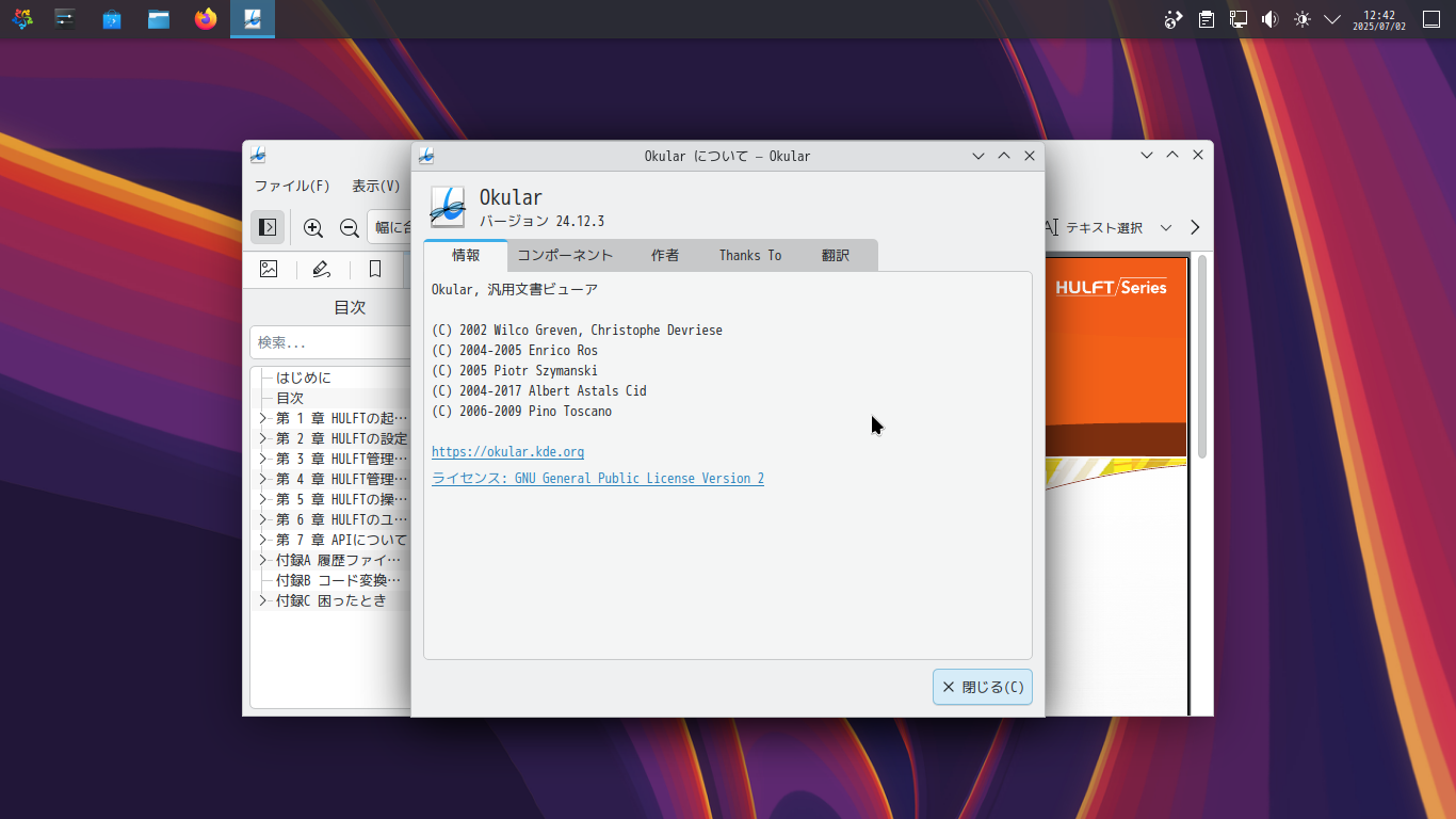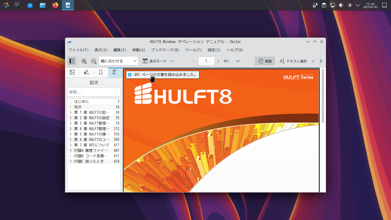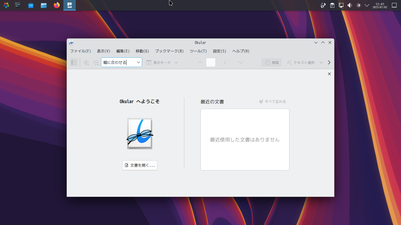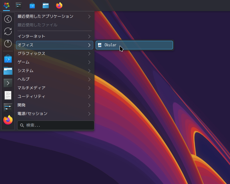 1. 概要 ドキュメントビューアとして「Okular」を使用します。 「Okular」は、デフォルトでインストールされています。 2. 起動 「スタート」→「オフィス」→「Okular」