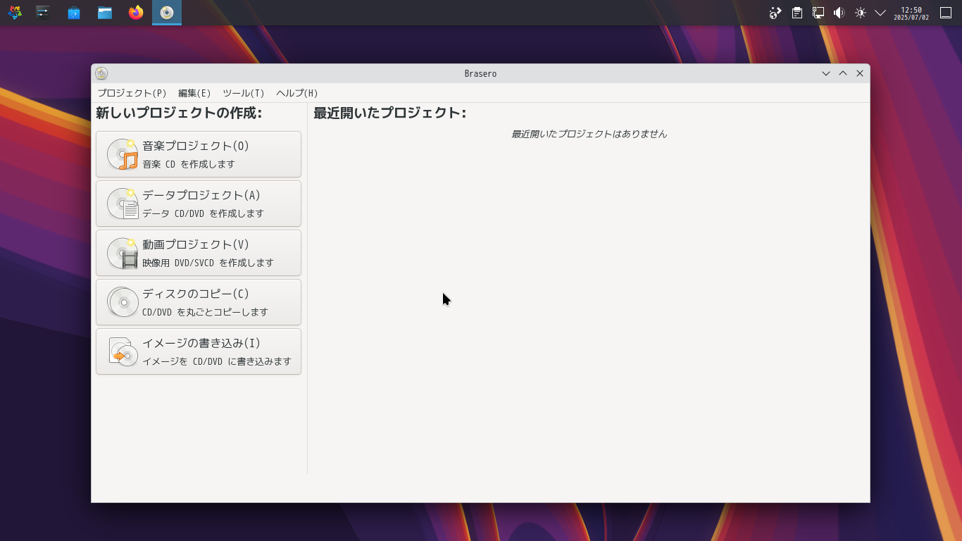 1. 概要 光ディスクライティングソフトとして「Brasero」を使用します。 「Brasero」は、デフォルトでインストールされています。 2. インストール 「root」ユーザ権限で。 dnf install -y brasero 3. 起動 「スタート」→「マルチメディア」→「Brasero」