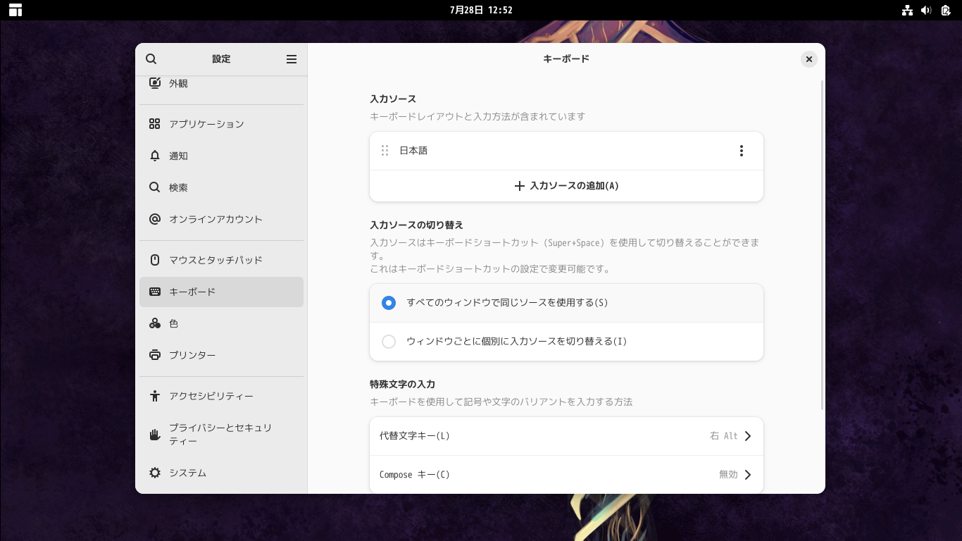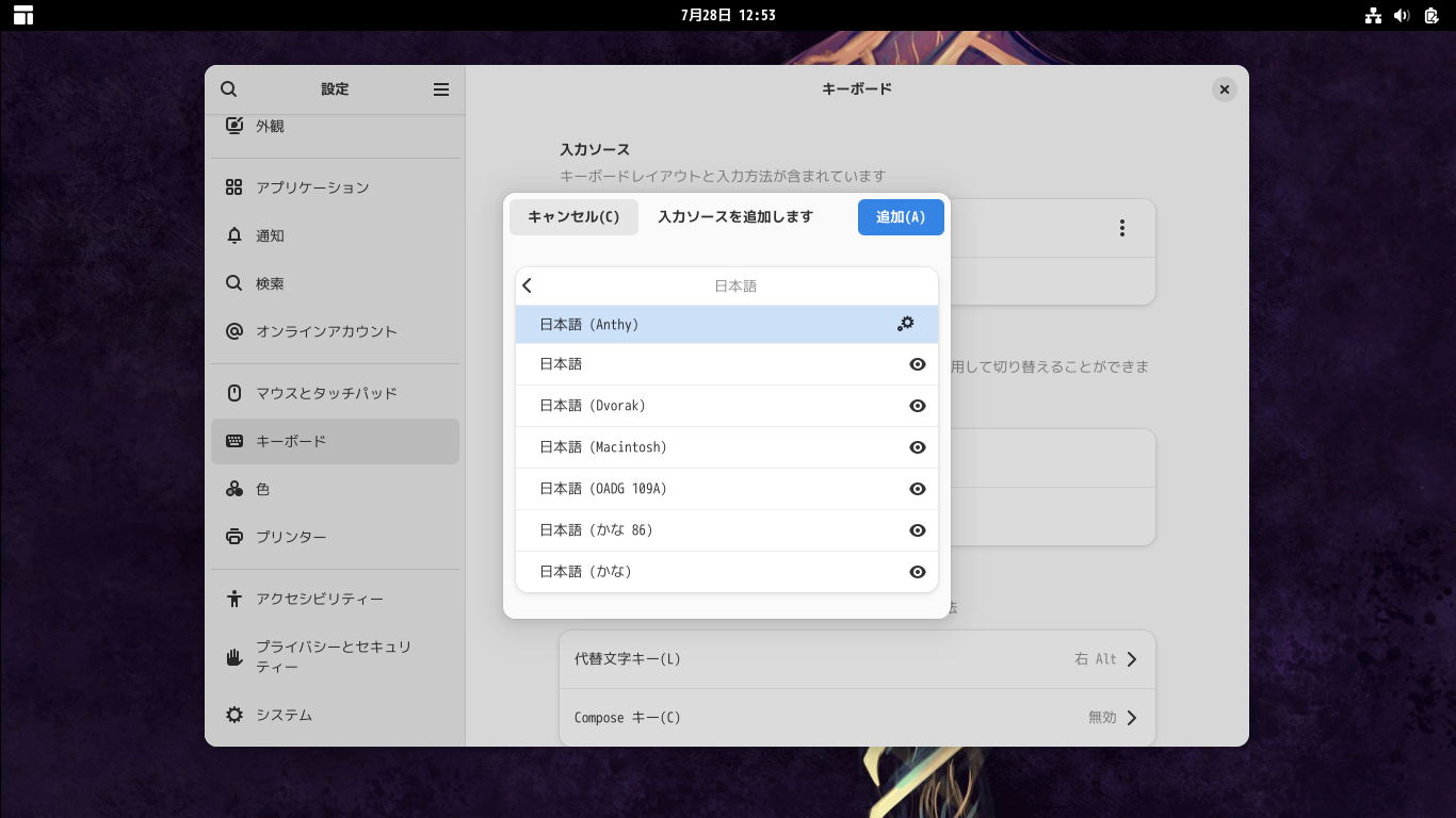 入力ソースの追加で、「日本語(Anthy)」を追加します。