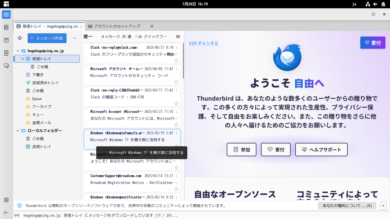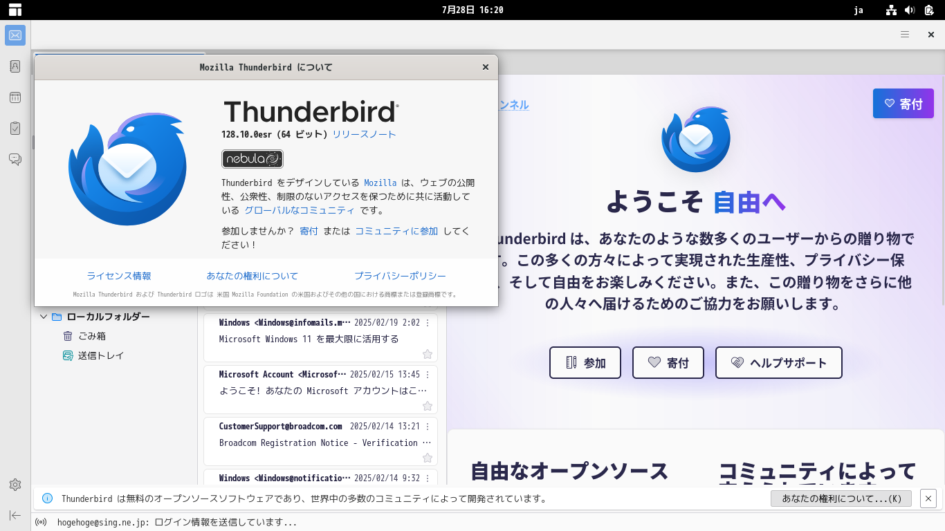 初回起動時は「メールアドレスのセットアップ」から始まります。 起動直後の状態です。 2025年7月28日の時点で、下記のバージョンでした。 「メールアドレスのセットアップ」他、操作方法については、「メール クライアント ソフト - Thunderbird」をご参照ください。 |