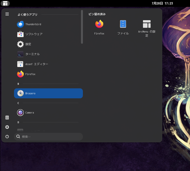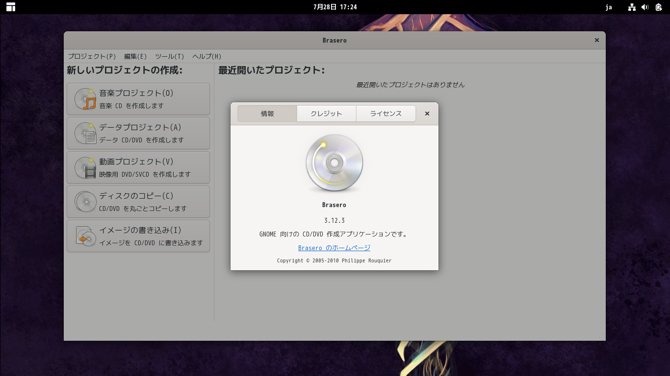 1. 概要 光ディスクライティングソフトとして「Brasero」を使用します。 2. インストール 「root」ユーザ権限で。 dnf install -y brasero ログインしなおさないと、メニューへ反映されませんでした。 3. 起動 「スタート」→「B」→「Brasero」