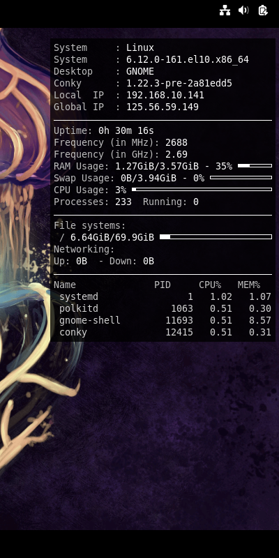 再ログイン後、デスクトップ右に、「Conky」の表示が現れます。