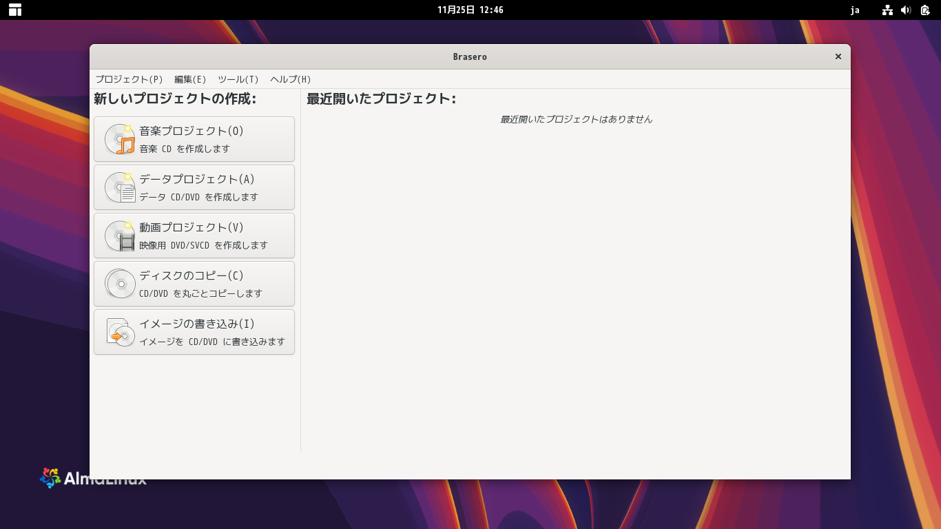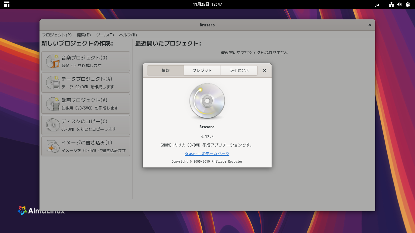 1. 概要 光ディスクライティングソフトとして「Brasero」を使用します。 2. インストール 「ソフトウェア(gnome-software)」で、「brasero」を検索して、インストールします。 3. 起動 「スタート」→「アクセサリ」→「Brasero」