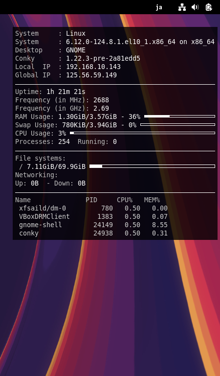 再ログイン後、デスクトップ右に、「Conky」の表示が現れます。