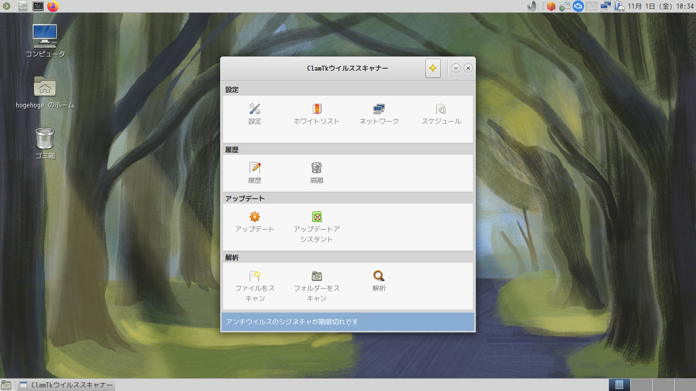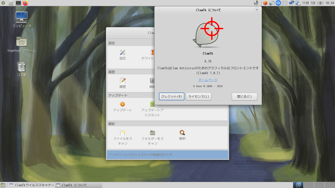 起動直後の状態です。 2024年11月1日の時点で、下記のバージョンでした。 「アンチウィルスのシグネチャが期限切れです」の表示を消す方法や、操作については「デスクトップ環境構築 - 共通事項 - アンチウイルスソフト ClamTk」をご参照ください。 |