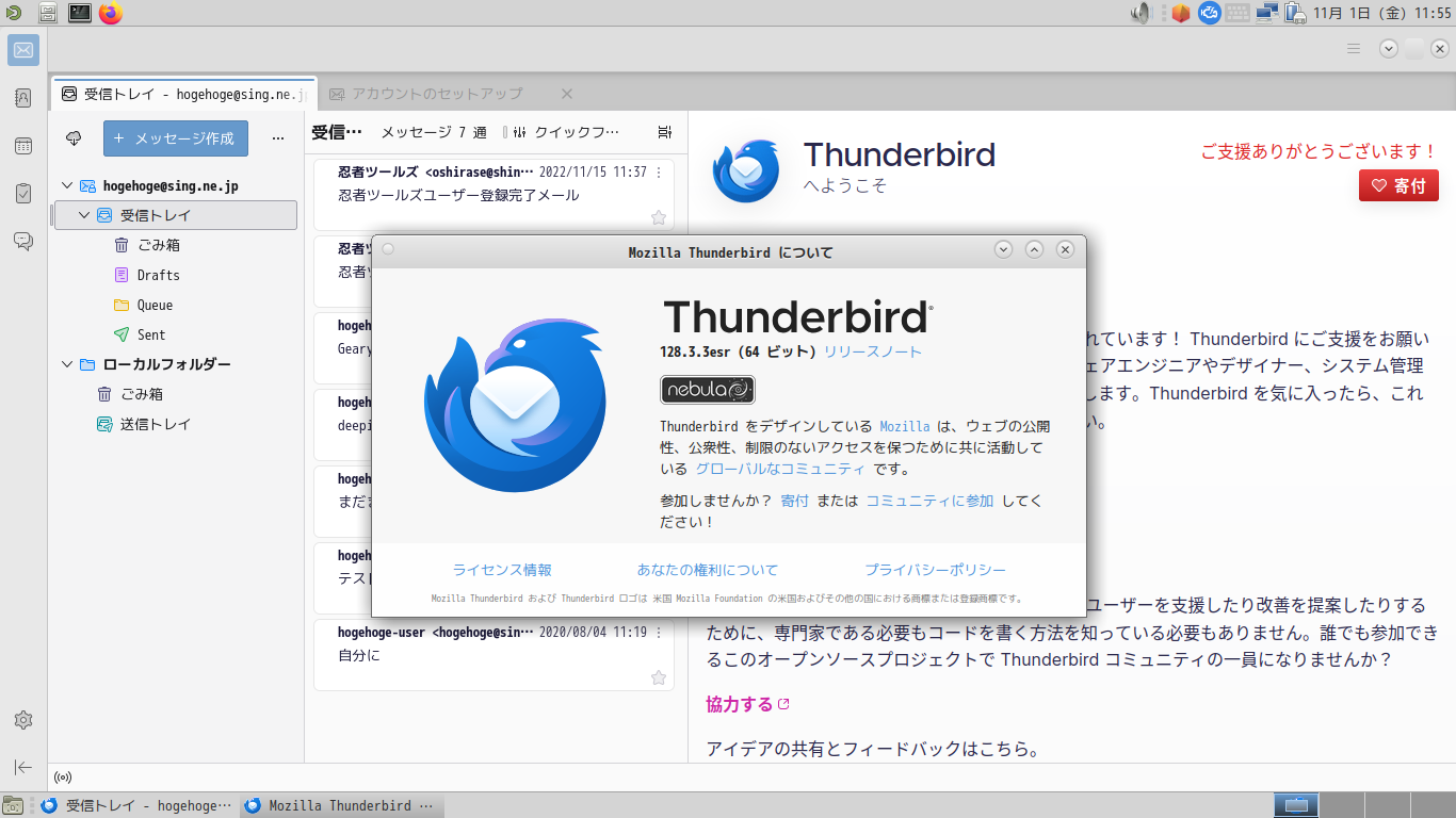 初回起動時は「アカウントセットアップ」から始まります。 起動直後に、受信トレイを開いた状態です。 2024年11月1日の時点で、下記のバージョンでした。 アカウントセットアップの他、操作方法については、「メールクライアント - Thunerbird」をご参照ください。 |
