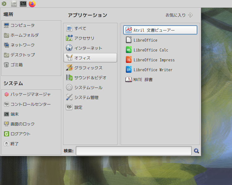 1. 概要 ドキュメントビューアとして、「Atril」を使用します。 「Atril」は、「MATE」のドキュメントビューアなので、デフォルトでインストールされています。 2. 起動 「スタート」→「オフィス」→「Atril」