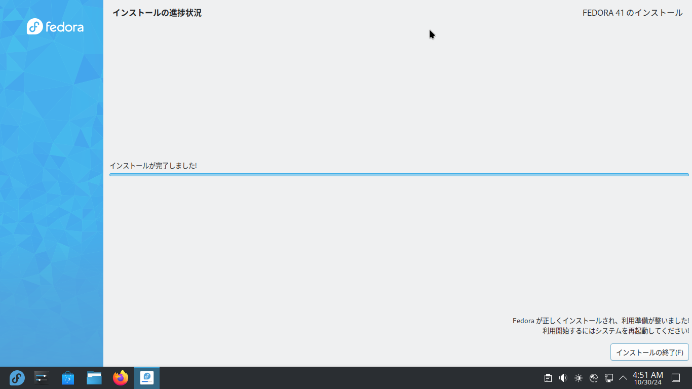画面や操作が「MATE」と若干異なる部分がありますので、記載しますが、その他は「Fedora - 41 - 共通事項」のインストールの手順をご参照ください。