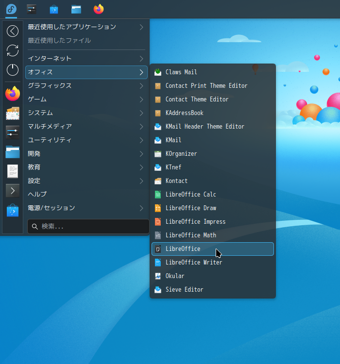 オフィススイートとして、「LIbreOffice」と「KDE」製のものがインストールされていますが、「KDE」のものはよう使いきらんので、「LibreOffice」を使用します。