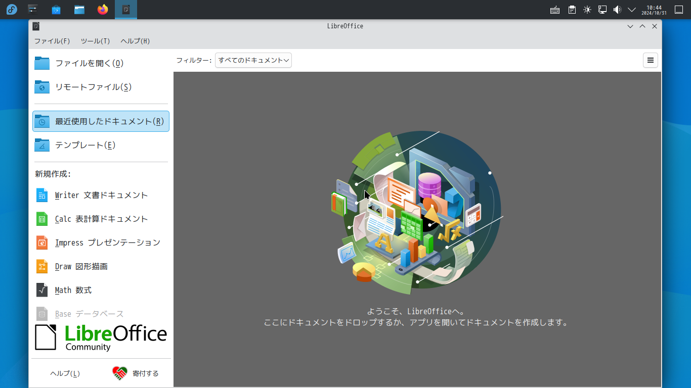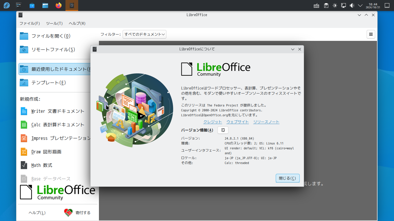 「LibreOffice Start Center」をメニューに表示させる方法に関しては、「Fedora - 41 - 共通事項」をご参照ください。